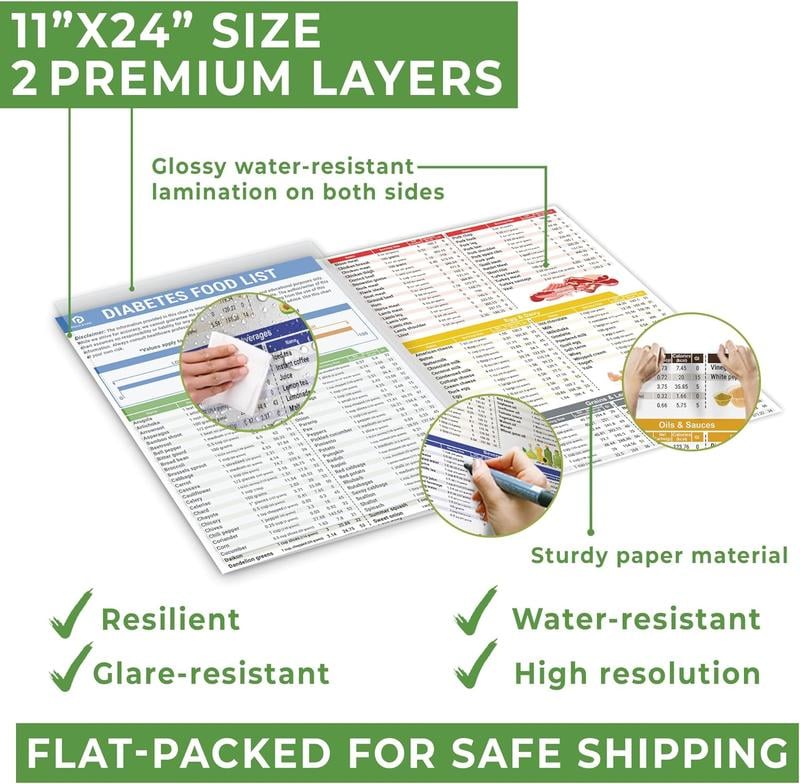 Printed on high-quality material for durability, these charts are perfect for everyday use in kitchens, schools, and clinics, with a user-friendly layout that makes finding information quick and easy. Includes diabetic food journal and printable diabetic meal plan to facilitate daily diabetic management.