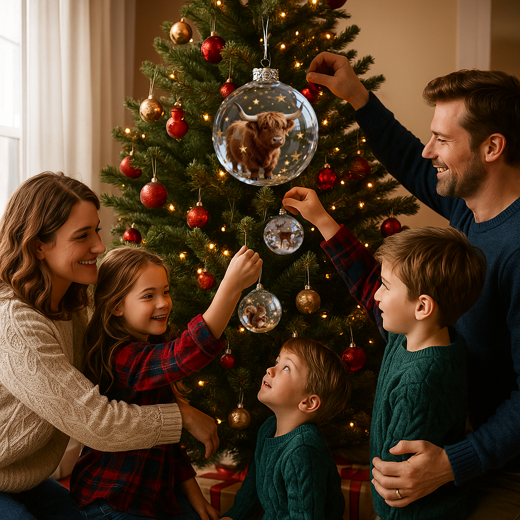 Adorn your Christmas tree with the beauty of the wild. Within a crystal-clear glass sphere, a lifelike Highland cow stands proudly among floating golden stars.